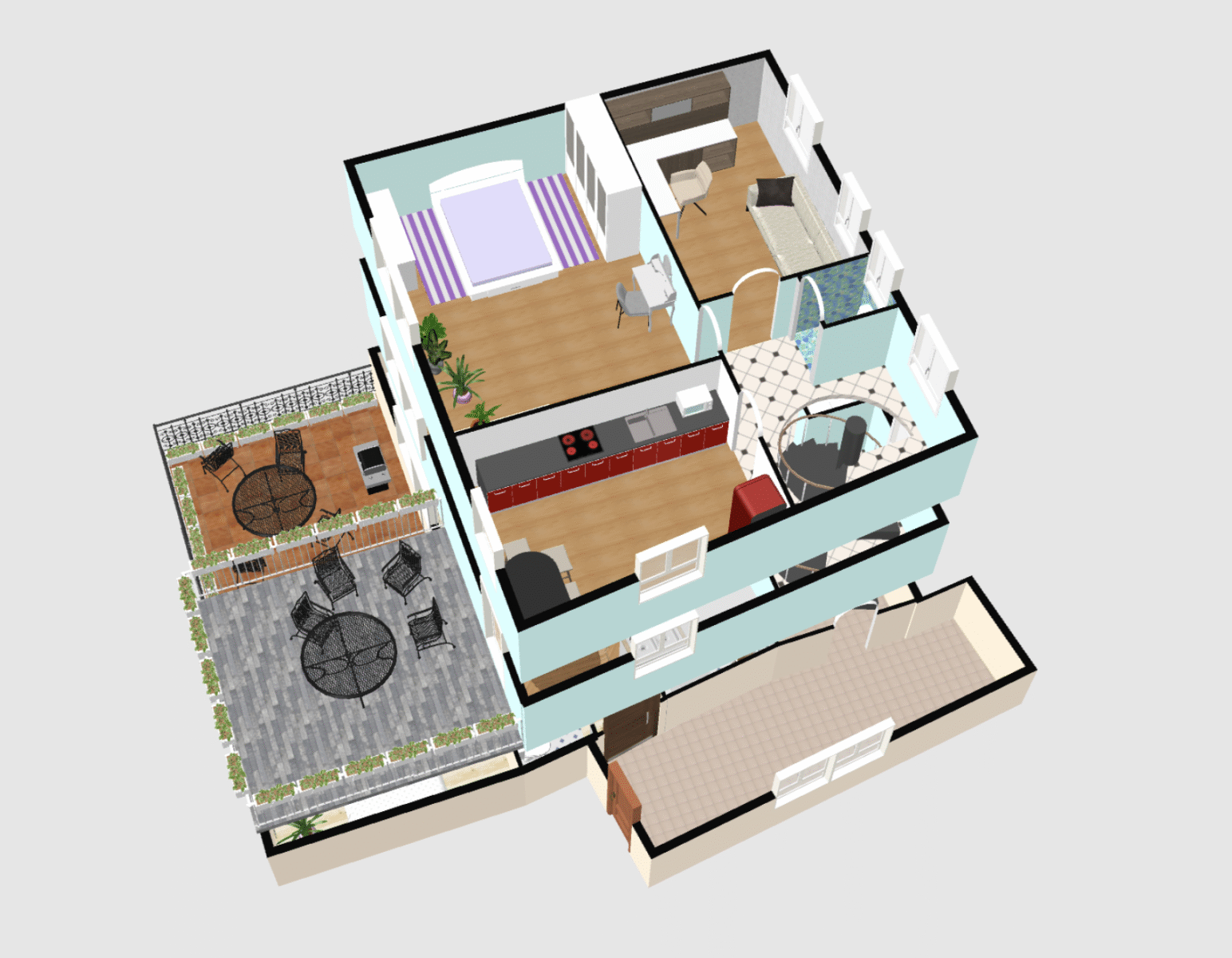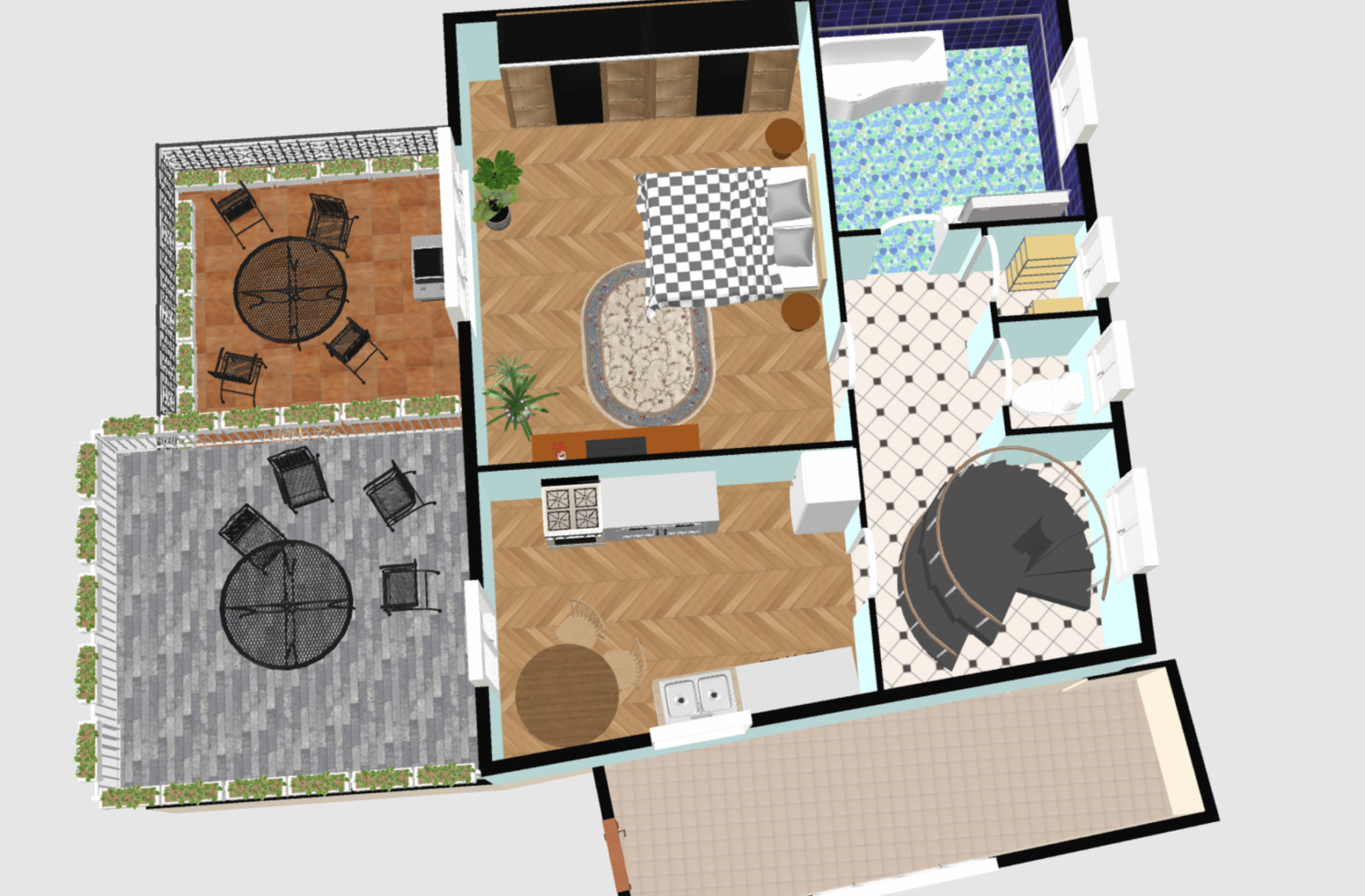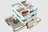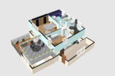 • 2. podlaží: kuchyňka s výstupem na prostornou terasu, obývací pokoj, koupelna s vanou a dvojumyvadlem, samostatná toaleta a technická místnost.