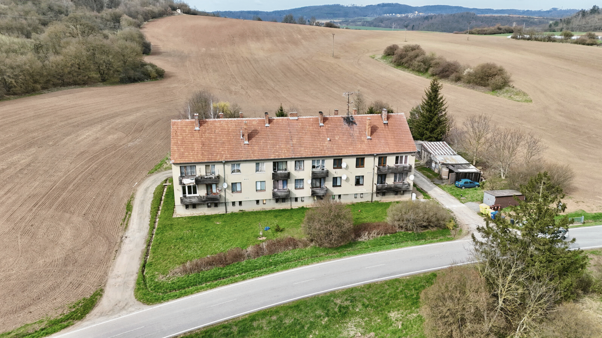 V bytě je k dispozici přívod elektřiny (230 V), zatímco odpad pro celý bytový dům je řešen pomocí jímky. K dispozici je i sklep. Nemovitost je vhodná zejména pro někoho, kdo má auto, neboť bytový dům sen nachází na okraji obce. Parkování je zde naprostou samozřejmostí přímo u vchodu domu.